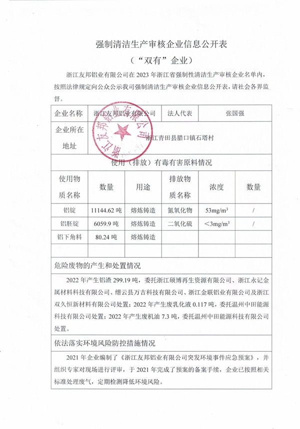 浙江友邦鋁業有限公司在2023年浙江省強制性清潔生產審核企業名單內,按照法律規定向公眾公示我司強制清潔生產生產審核企業信息公開表,請社會各界監督。